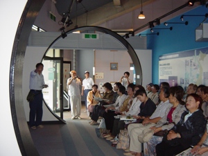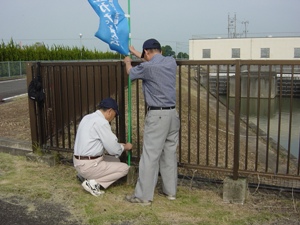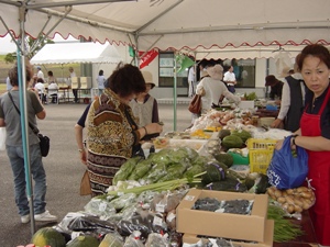 | 平成21年度の水の週間(8月1日〜7日)の行事として筑後川下流用水総合管理所では、8月1日(土)に佐賀機場の敷地内にある資料館や吐水槽を一般公開し、また資料館前の広場では地元JAによる農産物の展示即売会が行われました。「筑後川水の友」からは5名の会員が駐車場の整理や設営・後片付けなどのお手伝いをしました。 | |