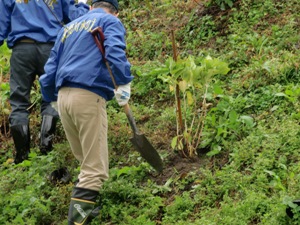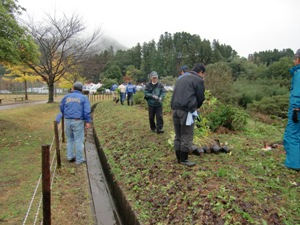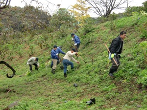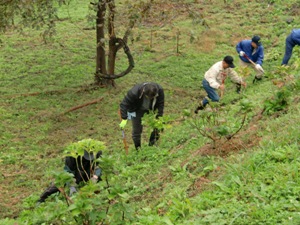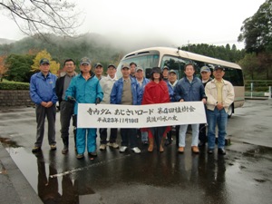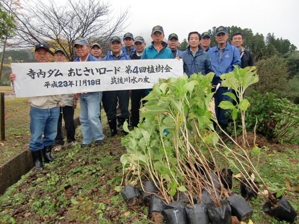 平成23年11月19日(土)に「寺内ダムあじさいロードづくり」において、第4回植樹会を開催しました。前日からの季節外れの大雨は、植樹会開催も危ぶまれる天候でありましたが、幸いにして開催時間の午前10時頃には小雨となり、植樹中には雨がやんで、雨にぬれた斜面の土地にあじさい苗を20本植樹しました。これまでに植樹したあじさいは300本以上に上り、また来年6月の花の時期が楽しみです。植樹は1時間程で終り、終了後バーベキューで参加者同士の懇親を深めました。会員14名の参加でした。