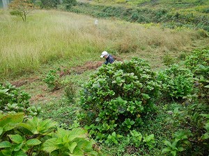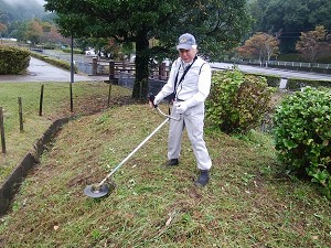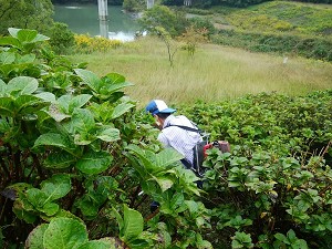 10月19日(土)明け方まで雨が降り、当日あじさい園に行く途中で寺内ダム周辺は小雨が降っていて草刈りは出来ないと思いましたが、 現地到着した8時40分には雨が止み9時から、下草刈りを、筑後川水の友会員6名で行いました。少ない人数でしたが、今回は雑草が伸びておらず、約1時間30分程度で作業完了しました。