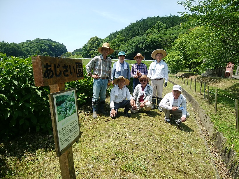 令和元年5月25日(土)9時から鑑賞会前に、筑後川水の友会員8名で、アジサイを植樹した斜面等をメインに草刈りを行いました。平場については、寺内ダムにて除草作業が完了していました。寺内ダム管理所の皆様有り難う御座いました。