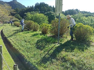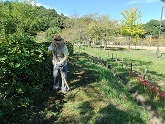 今年初めての秋風が吹き、山脈がきれいに見える清々しい朝となり、あじさい園の水路脇に彼岸花が咲きはじめた、9月24日(日)9時からあじさい園の草刈りを、筑後川水の友会員10名で実施しました。