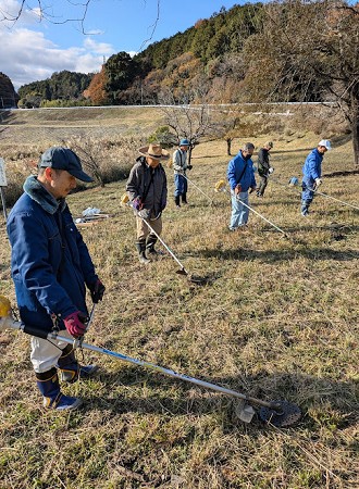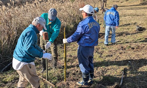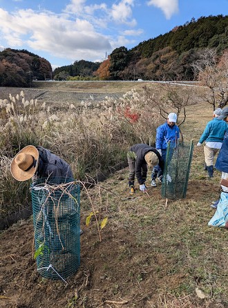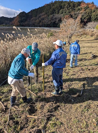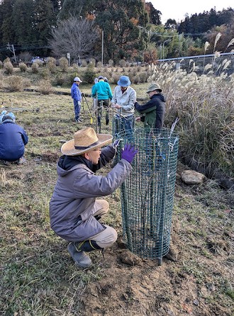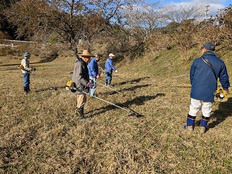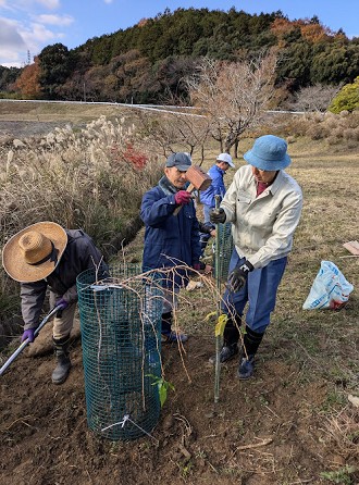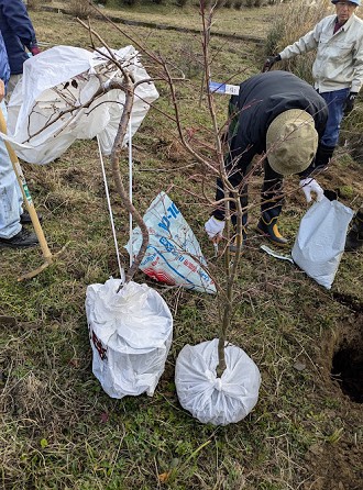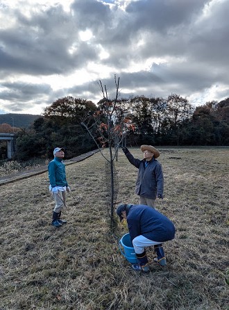 数日前に瀬振山に雪が積もり、昨日、朝倉市でも降雪が確認された寒い日曜日の22日、筑後川水の友会員10名の御参加により、紅葉1本としだれ桜1本を植樹、その後以前植樹した陽光桜に穂亮散布し、あじさいの枯れえを切りました。
