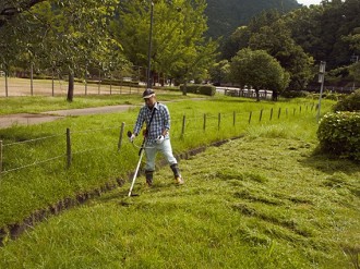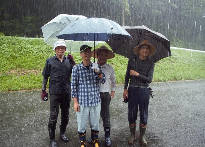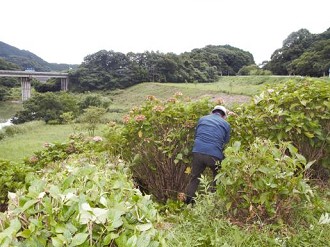 梅雨末期の空の中、下草刈りと花柄切りを9時から、筑後川水の友会員6名で実施しました。