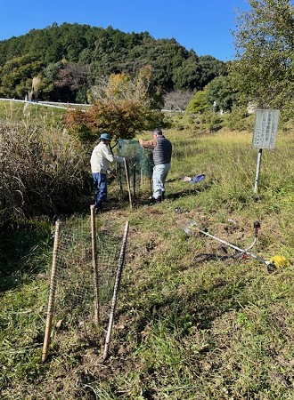 今日は晴天に恵まれ、参加者全員が快適に作業をすることができました。当日は筑後川水の友会員4名と少ない人数でしたが、幼木(桜、モミジ)周辺の草刈りやの幼木の手入れを行いました。